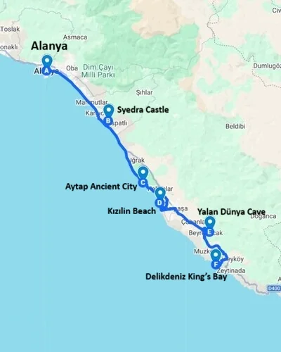 The Gazipaşa tour is especially convenient for participants from Alanya, as it combines historical landmarks and natural coastal locations within a single route. With a wide range of attractions, activities, and places to visit, Gazipaşa is a suitable option for those who prefer less crowded areas. This Alanya departure program, including Syedra Castle, Aytap Ancient City, Yalan Dünya Cave, Delikdeniz King’s Bay, Antiochia ad Cragum Ancient City, and Kızılin Beach, is among the preferred choices for those who want to use their day efficiently.
